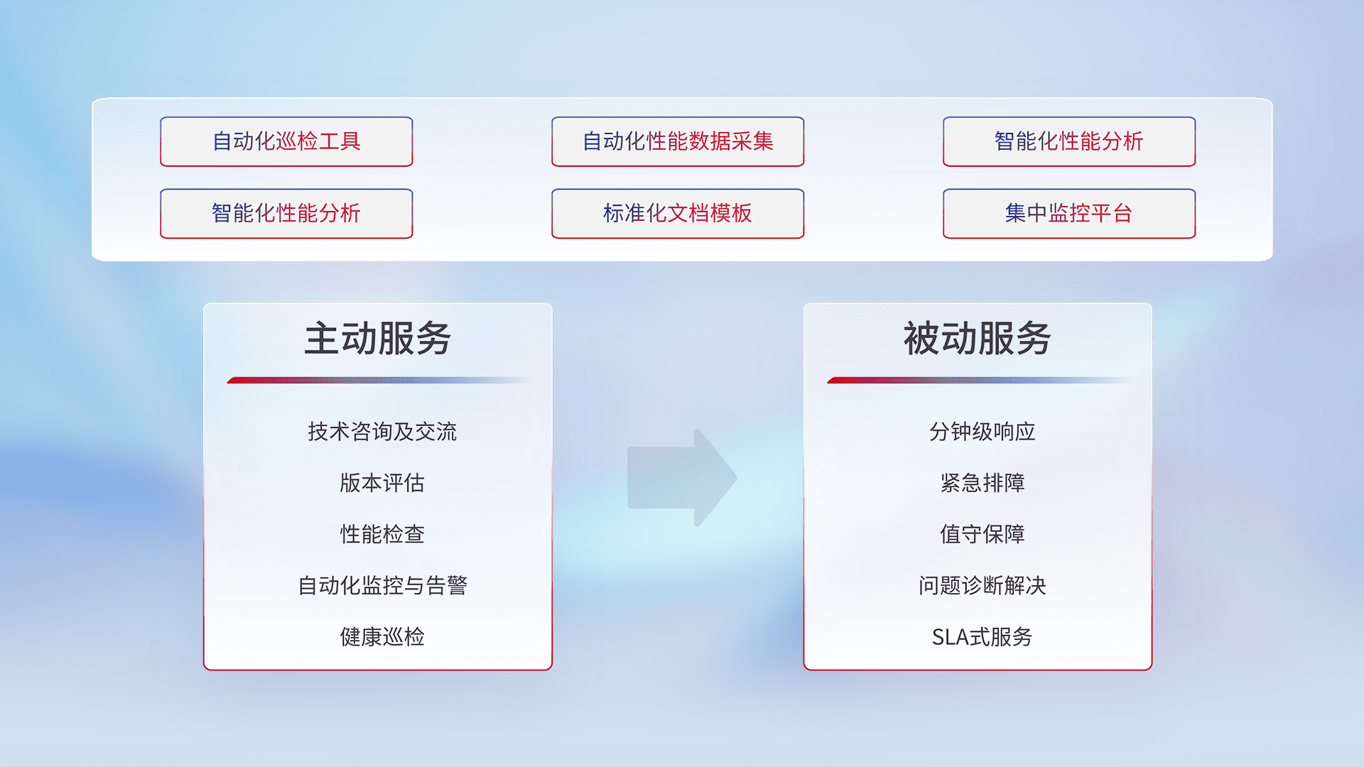 智能化工具和标准化文档,,,保障服务质量,,,提供主动服务(包含技术咨询、、、版本评估、、性能检查、、、、自动化监控与告警、、健康巡检)和被动服务包含(分钟级响应、、、、紧急排障、、值守保障、、、问题诊断解决、、、、SLA服务)。。。。